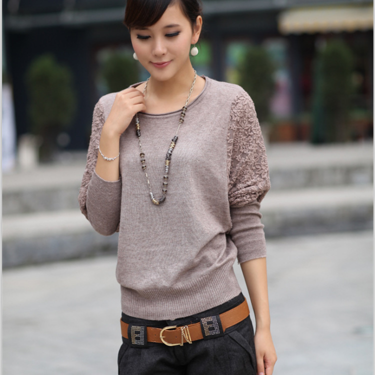 2015秋裝新款不起球不褪色韓版長袖蝙蝠衫寬松蕾絲袖針織衫女爆款 /