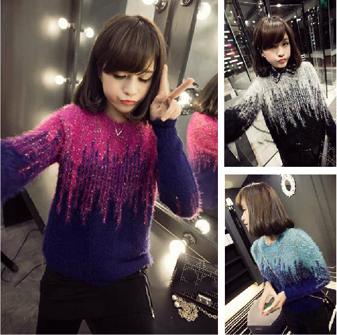 韓版寬松顯瘦金絲拼色撞色馬海毛套頭毛衣打底衫女 /