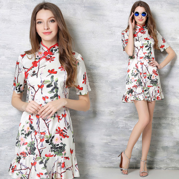 2016時尚立領短袖荷葉邊印花修身改良旗袍連衣裙夏 /