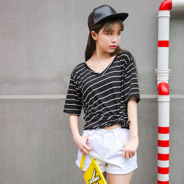 2016夏裝新款條紋V領休閑寬松T恤上衣女 /