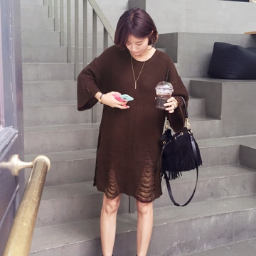 韓國代購2016春季新款時尚休閑側開叉鏤空磨破長款毛衣連衣裙 /