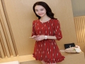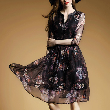 2016春裝新款女裝V領七分袖黑色通勤大擺雪紡印花連衣裙 /