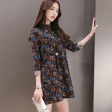 2016春裝新款女裝復古印花通勤A字裙圓領中袖寬松連衣裙 /