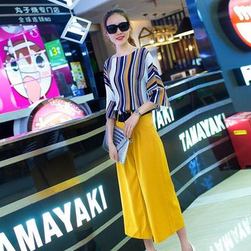 2016春夏女裝韓版時尚氣質寬松條紋上衣+闊腿褲兩件套套裝女 /