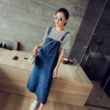 春夏季2016新款韓版寬松顯瘦修身百搭學院風純色連衣裙牛仔背帶裙 /