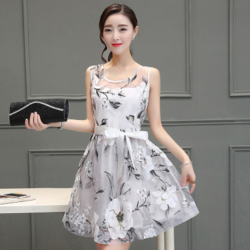 實拍2016韓版新款修身時尚顯瘦收腰歐根紗彈力印花連衣裙 /