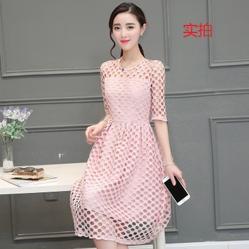2016春夏季新款時尚收腰 中袖蕾絲鏤空洞洞裙 中長款氣質連衣裙女 /