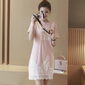孕婦裝2016夏新款孕婦裝韓版字母印花拼蕾絲豎條紋孕婦連衣裙 /