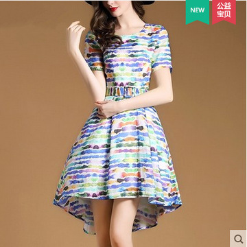 2016歐美夏裝新款女裝時尚彩色條紋圓領短袖連衣裙春夏款 /