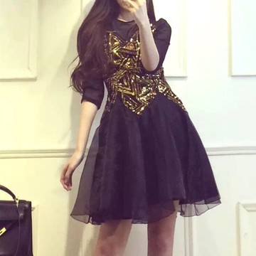 2016春裝新款時尚復古高端顯瘦亮片蓬蓬小禮服A字連衣裙 /