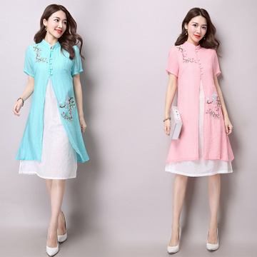 2016夏裝新款民族風女裝刺繡短袖棉麻連衣裙 /
