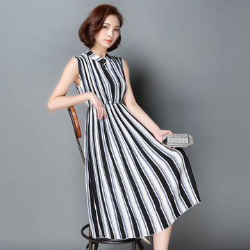 佐菲特時尚女裝雪紡連衣裙女夏裝新款韓版高腰中長款條紋裙無袖百褶裙 /