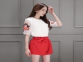 2016夏裝新款網紗拼接貼畫上衣+收腰闊腿短褲套裝 /