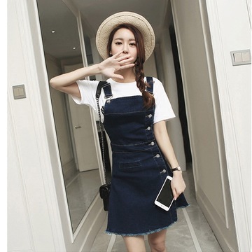 西鄉沐熙漫女裝2016春夏新款韓版修身單排扣高腰短裙a字連衣裙女時尚牛仔背帶裙 /