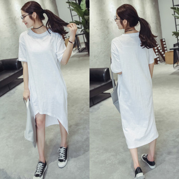 西鄉沐熙漫女裝2016夏裝新款寬松中長長款不規則開叉竹節棉圓領短袖T恤連衣裙女 /