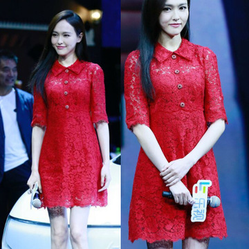 古菲莎女裝2016夏季唐嫣明星同款修身顯瘦氣質(zhì)中袖中長款紅色蕾絲連衣裙批發(fā) /