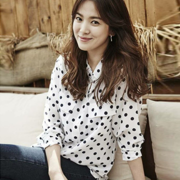 古菲莎女裝2016春夏新款太陽的后裔宋慧喬明星同款波點印花寬松長袖雪紡襯衫 /