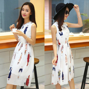 2016夏季女士韓版新款印花雪紡連衣裙百褶中長款修身顯瘦休閑長裙 /