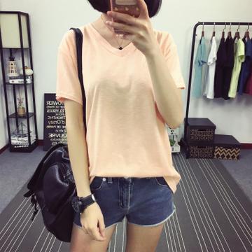 實拍2016夏季新款女裝V領純色竹節棉學生短袖T恤 /