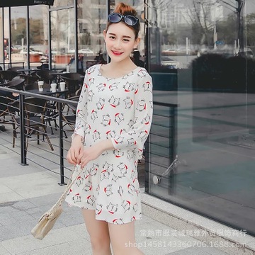 2016夏季新款女裝加大碼卡通貓咪印花喇叭袖連衣裙中長款雪紡修身 /