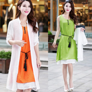 2016春夏裝新款韓版休閑兩件套棉麻連衣裙復古中長款亞麻套裝裙女 /