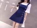 實拍新款修身單排扣磨邊高腰短裙a字連衣裙女時尚牛仔背帶裙 /