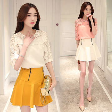 時尚蕾絲拼接漏肩上衣+百搭小短裙褲裙 /