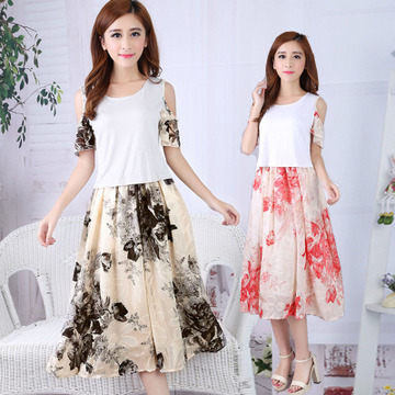 2016夏季新款韓版顯瘦假兩件碎花雪紡短袖長款連衣裙女 /