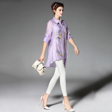 2016春季歐美超美天絲棉繡花連衣裙 中長袖修身顯瘦大碼襯衣 /