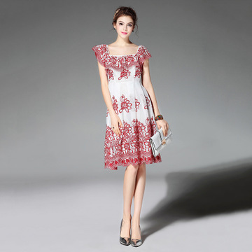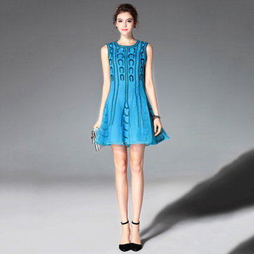 2016夏季新款歐美修身連衣裙 高檔泡泡紗繡花顯瘦無袖中長連衣裙 /