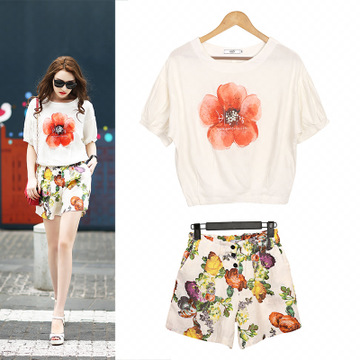 胖妹妹加大碼女裝夏裝新品寬松圓領休閑T恤印花短褲兩件套裝2505 /