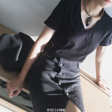 廠家供應新款zowzow嗆口小辣椒同款黑色短袖針織V領T恤上衣批發 /