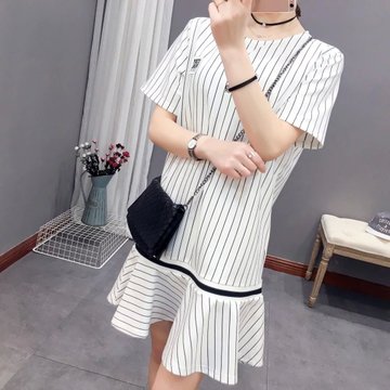 一件代發 歐洲站2016夏季新款休閑學院風荷葉邊豎條紋連衣裙女 /