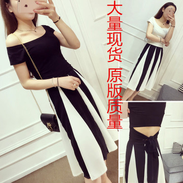 729 新款女裝韓版名媛性感露背系帶純色短袖T恤+撞色半身裙套裝 /