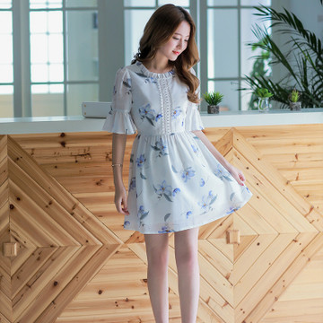 2016夏裝新款韓版修身荷葉袖印花雪紡連衣裙女打底短裙 /