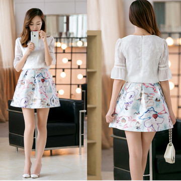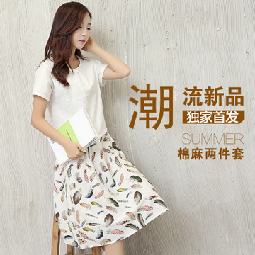 實拍2016夏季新款A字裙半身裙套裝裙兩件套印花短袖連衣裙 /