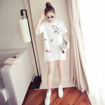 jto 韓國夏季新品圓領刺繡釘珠中長T恤休閑百搭顯瘦連衣裙女D230 /