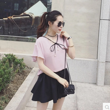 夏季新款韓版寬松V領純色百搭荷葉邊短袖套頭T恤 配細帶 A2524 /