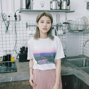 森月一件代發(fā) 歐美中性隨性風(fēng)景油畫圓領(lǐng)T恤上衣女 /
