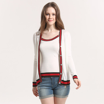 金絲撞色珍珠扣薄款V領萊恩羊毛針織開衫短款外套女兩件套 /