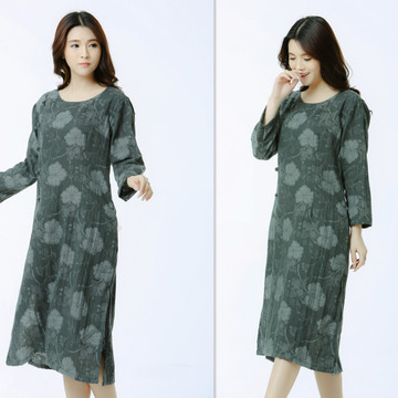 2016春夏新款棉麻文藝中袖復古花卉圖案圓領寬松大擺連衣裙女 /