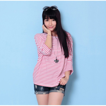 2016新款韓版寬松大碼短袖T恤女裝上衣顯瘦條紋五分袖半袖女 /