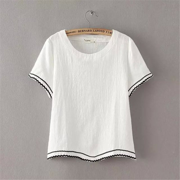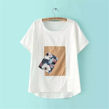 2016夏新款日系貼布印花亞麻棉麻女裝短袖時尚寬松上衣T恤 /