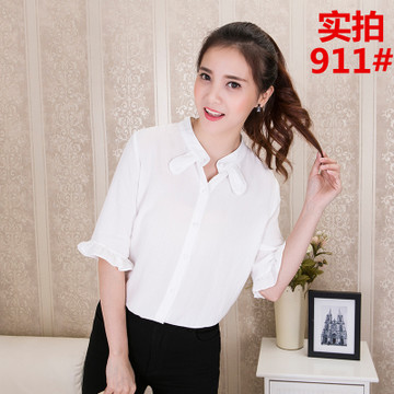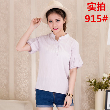 純色襯衫2016新款短袖棉麻寬松燈籠袖上衣打底衫女裝 /