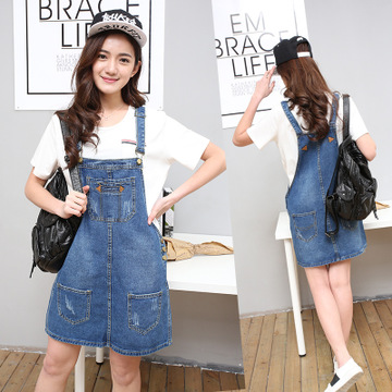潮流韓版破洞學生休閑牛仔背帶女夏顯瘦修身吊帶連衣半身中短裙 /