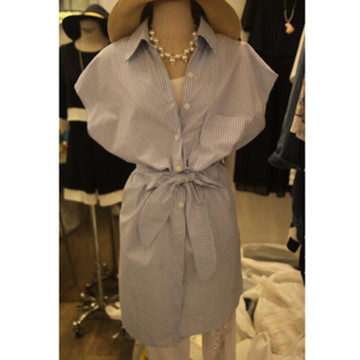 2016夏裝新款韓版藍色豎條紋收腰襯衫裙女短袖連衣裙潮 /
