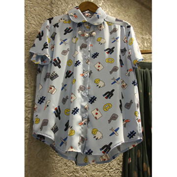 韓國東大門2016夏裝新款韓版娃娃領寬松印花襯衫短袖女休閑上衣潮 /