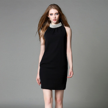 一件代理代發免費2016歐美時尚女裝無袖連衣裙縐紗釘珠黑色短款 /