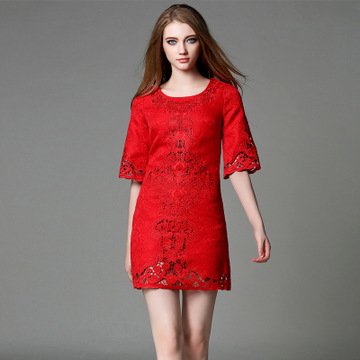 雅蘇米可2016新款女裝夏裝歐美大牌時尚燒花a字修身連衣裙潮 /