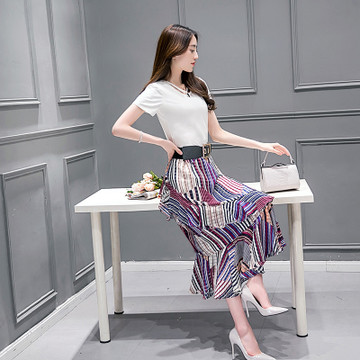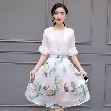 實(shí)拍2016夏季歐洲站新款兩件套短袖歐根紗雪紡印花半身短裙 /